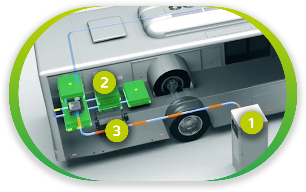 La infraestructura de recarga utilizada incluye un cargador que transforma la corriente alterna en corriente directa de modo que la energía se pueda almacenar en las baterías del autobús. Este cargador tiene una potencia de 150 kW que permite recargar la batería del autobús en 3.5 horas.